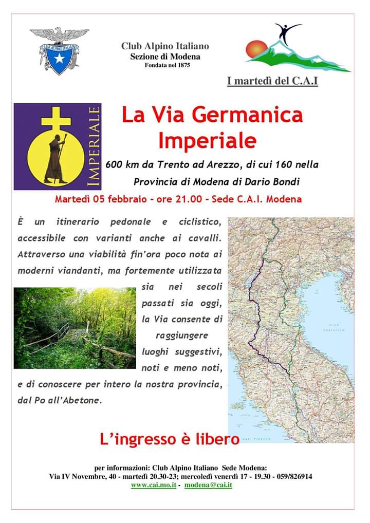 È un itinerario pedonale e ciclistico, accessibile con varianti anche ai cavalli. Attraverso una viabilità fin’ora poco nota ai moderni viandanti, ma fortemente utilizzata sia nei secoli passati sia oggi, la Via consente di raggiungere luoghi suggestivi, noti e meno noti, e di conoscere per intero la nostra provincia, dal Po all’Abetone.