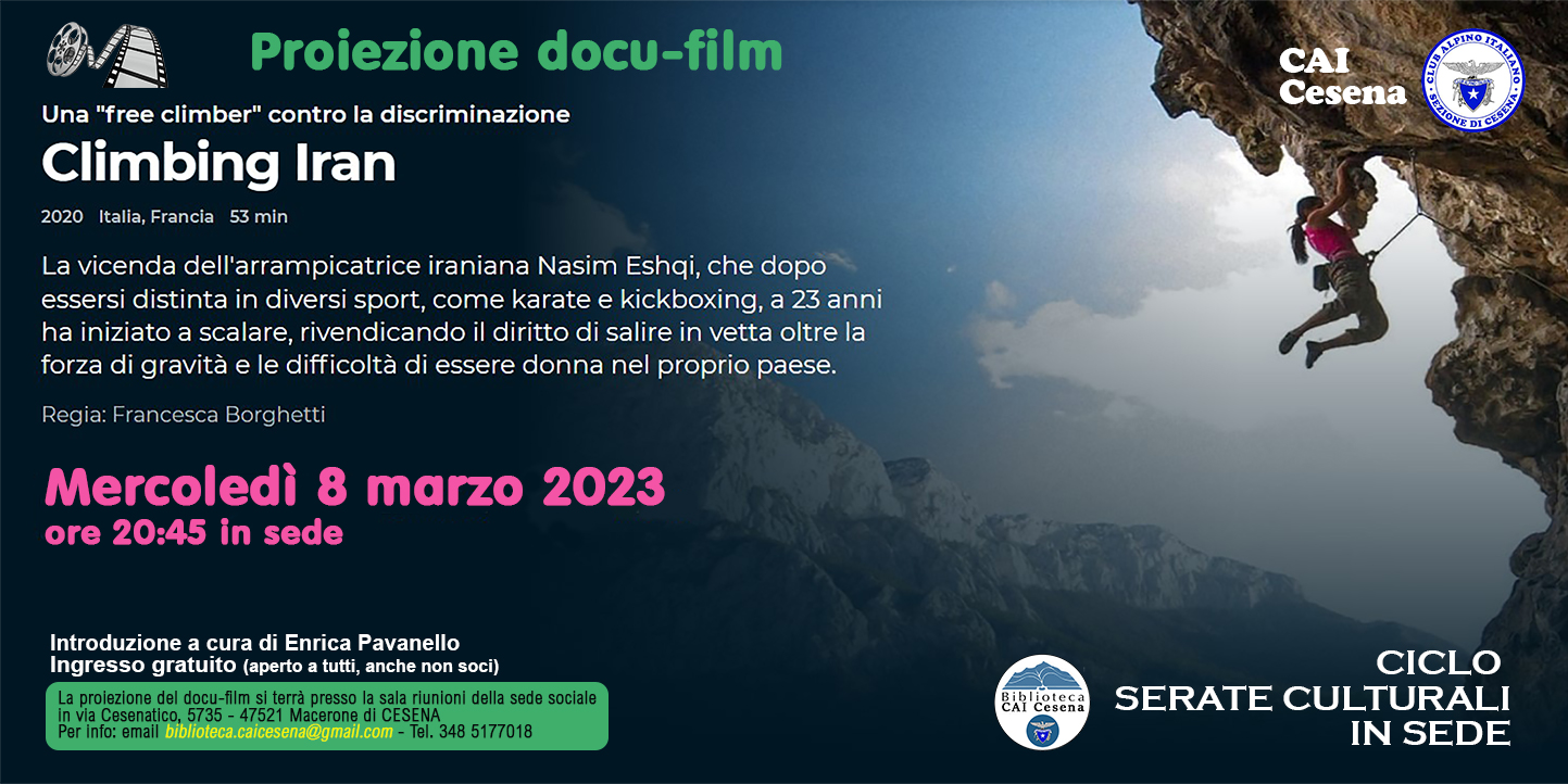Nel giorno della festa della donna, la sezione Cai di Cesena propone per mercoledì 8 marzo alle 20,45 il docu-film “Climbing Iran”, una free climber contro la discriminazione. Il film (regia di Francesca Borghetti, 53 minuti, 2020) racconta la vicenda dell’arrampicatrice iraniana Nasim Eshqui che dopo essersi distinta in diversi sport, a 23 anni ha iniziato a scalare, rivendicando il diritto di salire in vetta oltre la forza di gravità e le difficoltà di essere donna nel proprio Paese. Lo sport aiuta la giovane Nasim a riscattarsi da un futuro di prevaricazioni: durante il periodo dell’università, assiste a competizioni femminili e comprende che essere una donna con dei progetti è un sogno per il quale vale la pena combattere. L’introduzione al film sarà a cura di Enrica Maria Pavanello. Ne seguirà un dibattito-riflessione sulla ricerca di libertà attraverso l’arrampicata e la montagna.